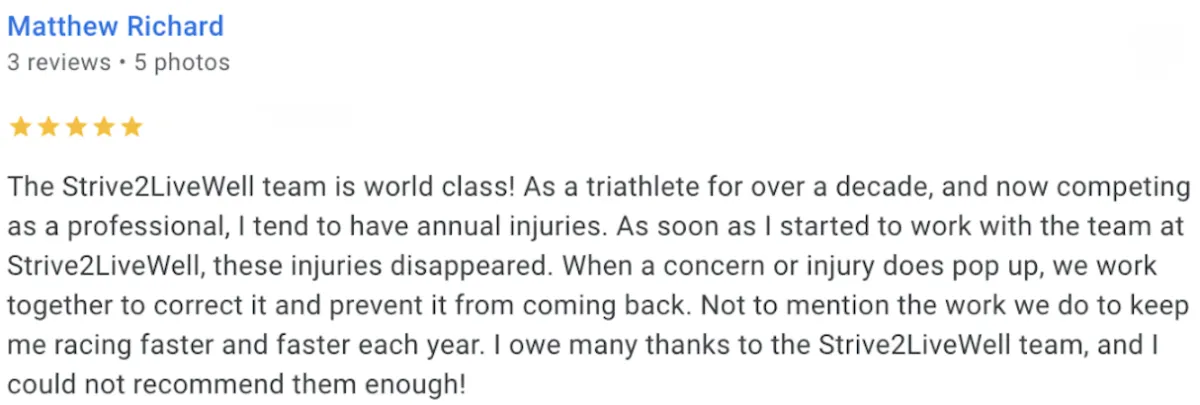 Whether you’re returning from injury, pushing for a competitive edge, or staying durable through a long season, Strive2LiveWell provides the expertise, precision, and support elite athletes expect—while meeting you exactly where you are.
